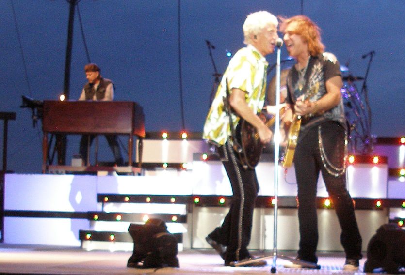 Kevin Cronin and Dave Amato, Neal Doughty on piano, asking the audience to sing along.